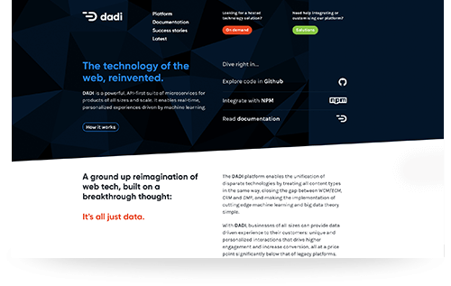 DADI is a powerful, API-first suite of micro-services for products of all sizes and scale. It enables real-time, personalized experiences driven by machine learning.