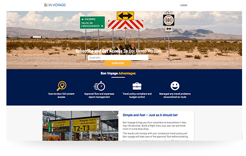 Bon Voyage brings you from anywhere to everywhere in less than 30 seconds. Book a flight, train, bus, taxi, car and hotel room in a one-stop shop.